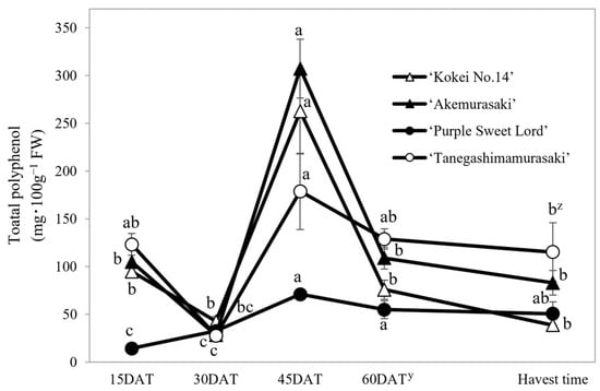 Effect of growth stages on the total polyphenol content in root system of four sweet potato cultivars. Each datum represents mean ± S.D. (n = 3). z Different letters beside each set of 4 cultivars represent significant differences at 5% level as determined by Tukey’s multiple range test (n = 3). y DAT: Days after transplant; nurseries of four cultivars were transplanted to Miyazaki research field on 29 May 2021.