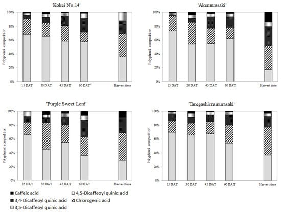 The total polyphenol content during the growth of the root system in the three purple-fleshed cultivars and ‘Kokei No. 14’ were investigated by HPLC analysis (Figure 4), and the percentage of each polyphenol among all polyphenols was evaluated (Figure 5). The changes in total polyphenol content in the root system showed similar trends for all cultivars, although there were some differences for ‘Purple Sweet Lord’. The total polyphenol content of the root system at 15 DAT was already almost the same as that of the storage roots at harvest, and then it increased rapidly at 45 DAT. For the four cultivars, the values at 45 DAT were approximately 1.4–4.9 times higher than the values at 15 DAT. In particular, a high polyphenol content of 307.3 mg·100 g−1 FW was recognized in the root system of ‘Akemurasaki’. Subsequently, the total polyphenol content of all cultivars decreased with root growth at harvest time. The decrease rate ranged from 28 to 85%.