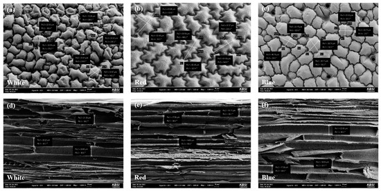 Cellular morphology analysis using SEM image of A. membranaceus sprouts grown in vitro cultured under three types of LED lights for 6 weeks. ((a–c): leaf, (d–f): stem).