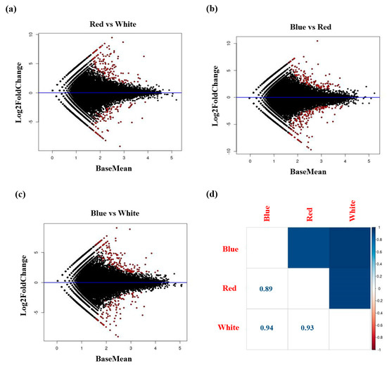 (a–c) Examples of differentially expressed genes (red points) identified by the MA-plot-based method of A. membranaceus sprouts under three types of LED lights. (d) A matrix showing the correlation for DEGs analysis of A. membranaceus sprouts under three types of LED lights.