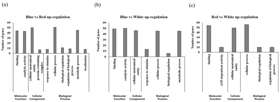 Upregulated genes through Gene Ontology (GO) analysis of differentially expressed genes (DEGs) in A. membranaceus sprouts under three types of LED light sources. (a) Blue vs. Red up-regulated gene expression, (b) Blue vs. White up-regulated gene expression, (c) Red vs. White up-regulated gene expression.
