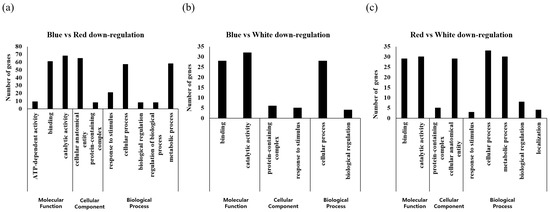 Downregulated genes through Gene Ontology (GO) analysis of differentially expressed genes (DEGs) from A. membranaceus sprouts under three types of LED light sources. (a) Blue vs. Red down-regulated gene expression, (b) Blue vs. White down-regulated gene expression, (c) Red vs. White down-regulated gene expression.