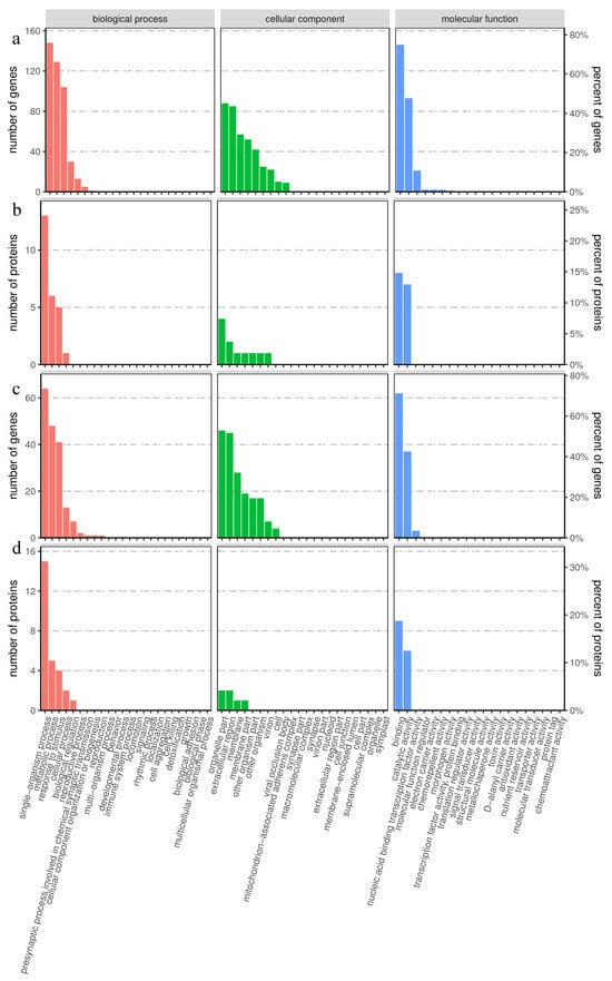 GO association analysis of proteomic and transcriptomic data. (a) GO classification maps of genes with opposite trends in protein and mRNA expression. (b) GO classification maps of proteins with opposite trends in protein and mRNA expression. (c) GO classification maps of genes with the same protein and mRNA expression trends. (d) GO classification maps of proteins with the same protein and mRNA expression trends.