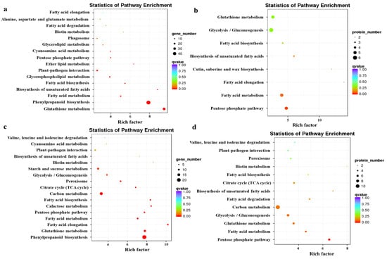 To further explore the biological pathways, and DEGs and DAPs function, KEGG pathway enrichment analysis was performed. The enrichment analysis is shown in Figure 3. The KEGG enrichment results for genes with opposite protein and mRNA expression trends (Figure 3a) were mainly in “Glutathione metabolism”, “Phenylpropanoid biosynthesis”, and “Fatty acid metabolism”. The KEGG enrichment results for proteins with opposite trends of protein and mRNA expression (Figure 3b) were mainly in “Pentose phosphate pathway”, “Fatty acid metabolism”, and “Fatty acid elongation”. The KEGG enrichment results for genes with the same protein and mRNA expression trends (Figure 3c) were in mainly “Phenylpropanoid biosynthesis”, “Fatty acid metabolism”, and “Fatty acid degradation”. The KEGG enrichment results for proteins with the same protein and mRNA expression trends (Figure 3d) were mainly in “Pentose phosphate pathway”, “Fatty acid metabolism”, and “Glutathione metabolism”.
