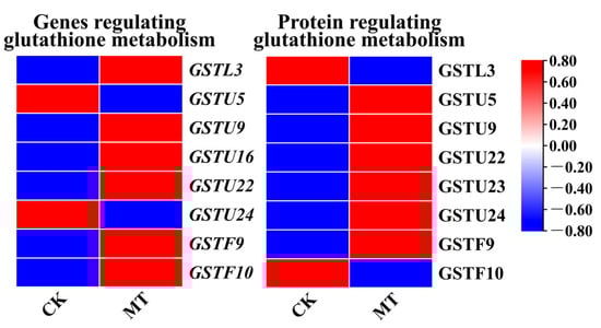 According to the KEGG enrichment results of genes with the same protein and mRNA expression trends (Figure 3c) and the KEGG enrichment results of proteins with the same protein and mRNA expression trends (Figure 3d), both proteins and mRNAs with the same expression trends were enriched to “Citrate cycle (TCA cycle) (ko00020)”, “Glutathione metabolism (ko00480)”, “Fatty acid degradation (ko00071)”, “Pentose phosphate pathway (ko00030)”, “Biotin metabolism (ko 00780)”, and “Fatty acid metabolism (ko01212)”. This study focused on the ‘Glutathione metabolism (ko00480)’ pathway, and showed differential expression of DEGs and DAPs of Glutathione S-transferases (GSTs) after treatment of exogenous MT in hairy roots. As shown in Figure 4, GSTU9, GSTU22, and GSTF9 were upregulated at both the transcriptional and protein levels after MT treatment in hairy roots. GSTL3, GSTU5, GSTU16, GSTU23, GSTU24, and GSTF10 showed differential expression at both transcriptional and protein levels after MT treatment in hairy roots.