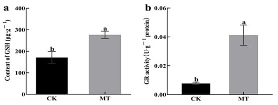 Effect of adding exogenous MT on the physiological indexes of hairy broccoli roots. (a) Effect of adding exogenous MT on endogenous GSH content of hairy broccoli roots. (b) Effect of adding exogenous MT on the GR activity of hairy broccoli roots. Data exhibit means ± SE of three replicates. Different small letters in the figure showed a significant difference (p ≤ 0.05).