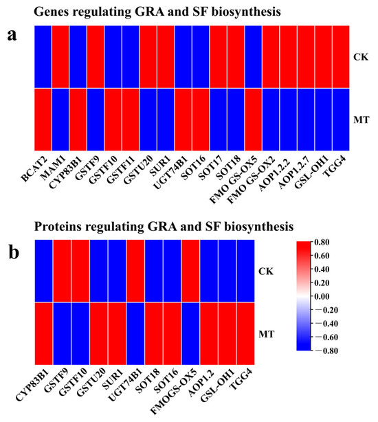 In this study, the gene expression pattern and protein content of MT-treated hairy broccoli roots were analyzed by the combination of RNA-seq and TMT techniques. KEGG analysis revealed that both proteins and mRNAs with the same expression trend were mainly enriched in “Glutathione metabolism (ko00480)” and “Proteasome (ko03050)”. “Proteasome (ko03050)”, and most of the DEGs and DAPs regulating these two pathways were downregulated. The results showed that endogenous GSH concentration and GR activity in hairy roots increased after MT treatment. Exogenous addition of GSH could promote the biosynthesis of GRA and SF, and both exogenous MT and GSH could upregulate the expression of sulfur transport-related gene GSTF11, thus promoting the biosynthesis of GRA.