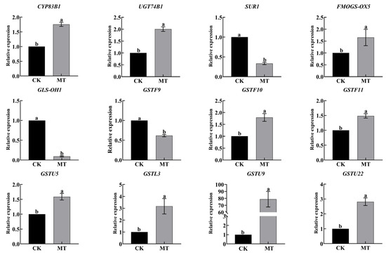 This study analyzed the results of expression and protein quantification of key genes of MT-treated hairy broccoli roots. CYP83B1, GSTF9, GSTF10, GSTU20, SUR1, UGT74B1, SOT18, SOT16, and FMOGS-OX5 regulate the synthesis of GRA, while AOP1.2.2, GSL-OH1, and TGG4 regulate the synthesis of SF. The detection of upregulated gene expression and increased protein content of CYP83B1 and SOT16-regulated genes indicated that MT treatment of hairy roots could promote the expression of CYP83B1 and SOT16 and the content of their regulated proteins. The relative expression of GSTU20, SUR1, SOT18, AOP1.2, GSL-OH1, and TGG4 genes was decreased but the protein content was increased, and the analysis may be due to the presence of other regulations or modifications of these genes during translating proteins (Figure 6).