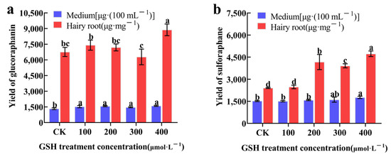 The effects of exogenous GSH on the synthesis of GRA (a) and SF (b) in hairy broccoli roots. Data exhibit means ± SE of three replicates. Different small letters in the figure showed a significant difference (p ≤ 0.05).