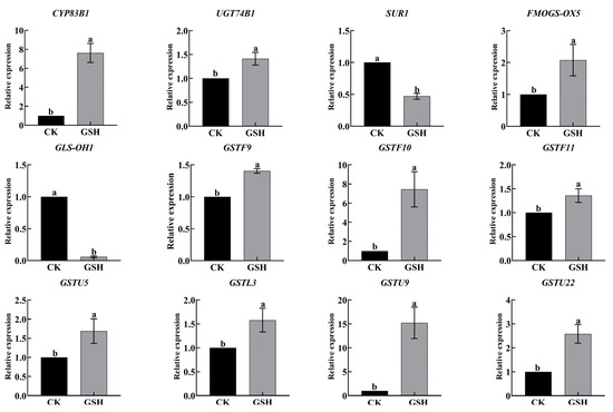 Effects of exogenous addition of GSH on the synthesis of glucoraphanin and sulforaphane, as well as the expression of glutathione-related genes in hairy broccoli roots. Data exhibit means ± SE of three replicates. Different small letters in the figure showed a significant difference (p ≤ 0.05).