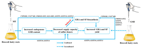 In this study, RNA-Seq and Tandem mass spectrometry tagging (TMT) were used to investigate the molecular mechanisms involved in the effect of exogenous MT on the transcriptional–translational level of GRA in hairy broccoli roots. In addition, endogenous GSH, glutathione reductase (GR) activity, GRA and SF production, as well as the expression of genes related to GRA and SF synthesis and sulfur transport in hairy roots under the treatment of exogenous GSH and MT have detected. This study provides a new perspective to explore the complex molecular mechanism of MT-mediated GSH transport to regulate GRA and SF synthesis.