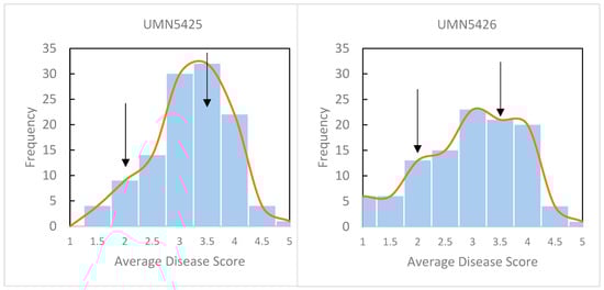 Replicated disease phenotypes were obtained from 225 F1 plants at 10 days post-inoculation (dpi) with P. syringae pv. syringae strain 1021. A total of 116 plants were tested from UMN5425 developed from a cross with the susceptible plant as the female parent and 109 plants from UMN5426 with the resistant plant as the female parent. Disease symptoms were scored on a 1 to 5 scale where 1 = no symptoms and 5 = all leaflets necrotic and dried with dehiscence of two or more leaflets (see Materials and Methods for the complete disease scale). The scores from nine leaflets were averaged, and plants were categorized as resistant (mean score of 1 to 2), semi-resistant (>2 to 3), and susceptible (>3 to 5) (Figure 1). In total, 61 susceptible, 127 semi-resistant, and 37 resistant plants were identified. Estimates of means, range, standard deviation, coefficient of variation (CV), and broad sense heritability (H2) were calculated by population and for all F1 plants (Supplementary Table S1) [37]. Mean and CV values were not different among populations or for all F1 plants. Disease score means were 3.07 for UMN5425 and 2.79 for UMN5426, whereas CVs were 26% and 35% for UMN5425 and UMN5426, respectively. The value of heritability was high (80%), suggesting that the disease score is less affected by environmental influences.