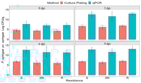 Comparison of average bacterial populations of P. syringae pv. syringae strain 1021 using qPCR and culture plating in resistant, semi-resistant, and susceptible plants immediately after inoculation (0 dpi), and 3, 6, and 9 dpi. The bars represent the average of nine leaflets and the standard deviation of the mean. dpi = days post-inoculation.
