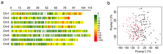Single nucleotide polymorphism sites (SNPs) identified in the F1 mapping population. (a) Distribution of SNP markers across eight alfalfa chromosomes using a 0.1 Mb window size. The colored lines represent the marker density, as shown on the right color legend. (b) Principal component analysis (PCA) of SNPs. The plot was colored by subpopulations, with UMN5425 in black and UMN5426 in red.