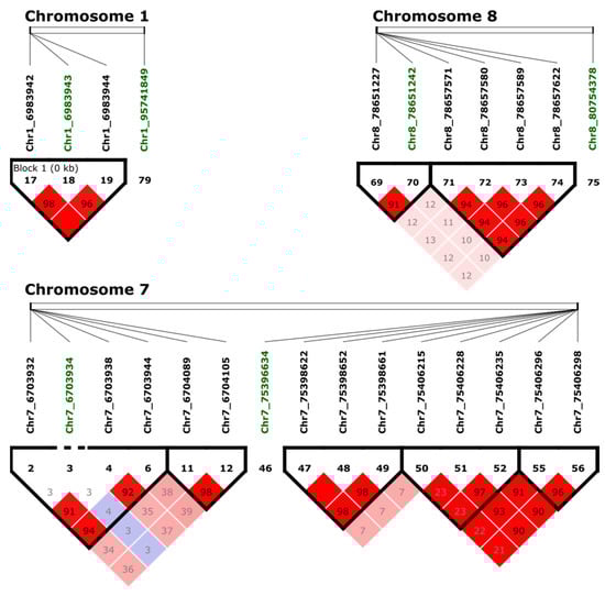 LD analysis among markers associated with tolerance to BSB was performed using adjacent SNPs in a 10 kb window by Haploview v4.2 [37]. Three blocks were identified with significant SNPs (Figure 4). One block in Chr1 with three adjacent SNPs (Chr1_6983942, Chr1_6983943, and Chr1_6983944) was identified. The extent of LD in a genome can be statistically quantified, allowing a better understanding of genomic variations [38]. The linkage score of Chr1_6983942 and Chr1_6983943 was 98%, and the linkage score of Chr1_6983943 and Chr1_6983944 was 96%. Interestingly, based on the Pearson’s correlation, the pairwise comparison between the markers Chr1_6983942 and Chr1_6983943 showed a strong LD with a correlation of 81%, while Chr1_6983944 compared with Chr1_6983942 correlated 51%, and Chr1_6983943 had a correlation of 53%. Based on these findings, there are three SNPs within the same region of the chromosome, but only Chr1_6983942 and Chr1_6983943 had a significant LD. In Chr7, the markers Chr7_6703932, Chr7_6703938, and Chr7_6703944 are in LD, but they were not in LD with the significant marker Chr7_6703934. One block was identified in Chr8 with two markers (Chr8_78651227 and Chr8_78651242). Additional significant associated markers were not in LD with adjacent markers.