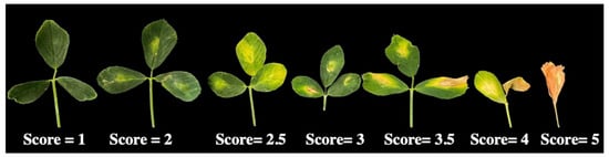 Symptoms were scored visually at 10 days after inoculation on a 1 to 5 scale (Figure 5); 1 = no visible symptoms of infection; 2 = minimal chlorosis in the infiltrated area; 2.5 = chlorosis extending beyond the infiltrated area; 3 = necrosis with chlorosis in the infiltrated area; 3.5 = necrosis and chlorosis extending beyond the infiltrated area; 4 = necrosis and chlorosis of entire leaflets, dehiscence of one or more leaflet; 5 = all leaflets necrotic and dried, dehiscence of two or more leaflets. Disease scores from nine leaflets were averaged and plants were categorized as resistant (1 to 2), semi-resistant (>2 to 3), or susceptible (>3 to 5).