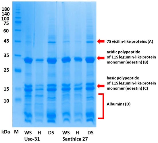 SDS-PAGE profiles of evaluated defatted products derived from seeds of two hemp cultivars under reducing conditions (WS—defatted flour from whole seeds; H—defatted flour from milled hulls; DS—defatted flour from dehulled hemp seeds, M—protein molecular weight standard ROTI®Mark Tricolor Xtra, Carl Roth GmbH + Co. KG, Karlsruhe, Germany).