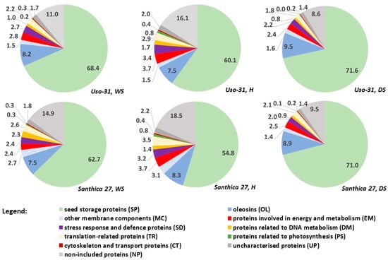 The relative abundance of protein items in the MP88 set in the total protein profiles of whole seeds, hulls, and dehulled seeds with respect to the two cultivars studied (Uso-31, Santhica 27) is shown in Table 3. The percentages of the protein classes (including the group of proteins not included in the MP88 set) are expressed using pie charts in Figure 2.