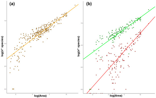 Power function shown in the linearized form (logarithmic space), expressing the relationship between area (x axis) and the number of species (y axis): (a) total flora (i.e., both native and alien species), orange dots and regression line; (b) only native (green dots and regression line) and only alien (red dots and regression line) species.