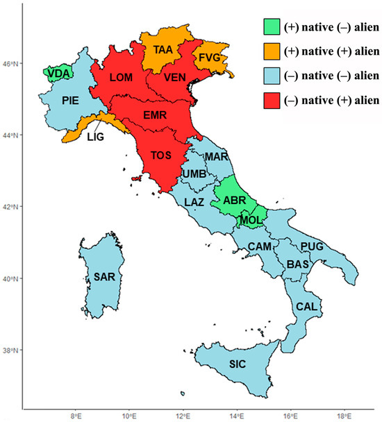 Considering only native species, the richest regions are Liguria, Friuli Venezia Giulia, Abruzzo, and Valle d’Aosta, while Sardegna, Puglia, Sicilia, and Emilia-Romagna are the poorest (Table 3). Concerning alien species, the richest regions are Liguria, Lombardia, Friuli Venezia Giulia, Trentino-Alto Adige, and Veneto, while Basilicata, Valle d’Aosta, Molise, Calabria, and Puglia are the poorest (Table 4).