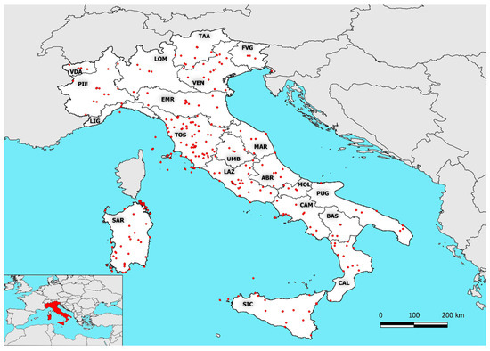 The study area corresponds to Italy (Figure 3), a country lying at the center of the Mediterranean basin, which shows a wide latitudinal extent, representing a long narrow bridge between the temperate and Mediterranean bioclimates [47].