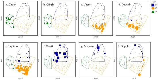 Diagrams of NMS ordination analysis along axes 1 and 2 showing the positions of separated cluster groups (SW = subalpine woodland, SS = subalpine shrubland, WF = wet forest) with indicator species overlays. Within ordination diagrams, larger plot symbols represent higher species abundance. Wet forest indicator species, Cheirodendron trigynum (a) and Cibotium glaucum (b), were exclusively found in plots within the WF cluster. Subalpine shrubland indicator species, Vaccinium reticulatum (c), Deschampsia nubigena (d), and Leptecophylla tameiameiae (e), were most frequent and abundant in the SS community. Similarly, non-native Ehrharta stipoides (f) was found in all types but is far more abundant in the subalpine woodland. Myoporum sandwicense (g) was only found in the SW community, whereas Sophora chrysophylla (h) was abundant in two SS plots, but it indicates the SW cluster due to high frequency among SW plots.