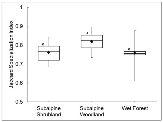 The average Jaccard habitat specialization index of indicator species (Table 2) differs by community. Indicator species in the subalpine woodland (N = 15) are significantly more likely to be habitat generalists than those species that indicate the subalpine shrubland (N = 14) and wet forest (N = 26) communities. Values range from specialist (0.5) to generalist (1.0) based on occupancy and species co-occurrence data [34]. Communities that share the same letter are not significantly different.