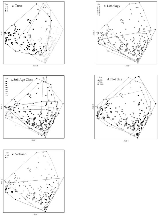 Diagrams of NMS ordination analysis along axes 1 and 2 showing the sample plots grouped by categorical variables: presence of tree life forms > 3 m in height (a), 0 = treeless, 1 = <10% tree cover, 2 = ≥10% tree cover); lithology (b), 1 = aa, 2 = pahoehoe, 3 = aa + pahoehoe, 4 = sand + cobbles, 5 = tephra fallout + ash; soil age class (c), 1 = <750 year, 2 = 750 < 1500 year, 3 = 1500 < 3000 year, 4 = 3000 < 5000 year, 5 = 5000 < 13,000 year, 6 = 13,000 < 30,000 year, 7 = 30,000 < 50,000 year, 8 = >140,000 year; sample plot size (d), m2; and volcano (e), ML = Mauna Loa, H = Haleakalā).