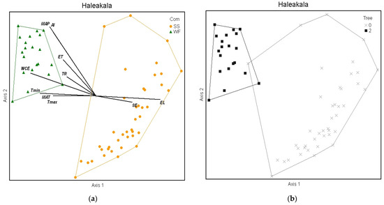 Diagram of NMS ordination analysis along axes 1 and 2 showing the positions of separated cluster groups (SS = subalpine shrubland and WF = wet forest) on the Haleakalā volcano. Significant environmental variable joint plot overlays (see Table 3) vividly display the differences between communities (a). Grouping by plots with trees > 3 m closely resembles the community diagram (b).