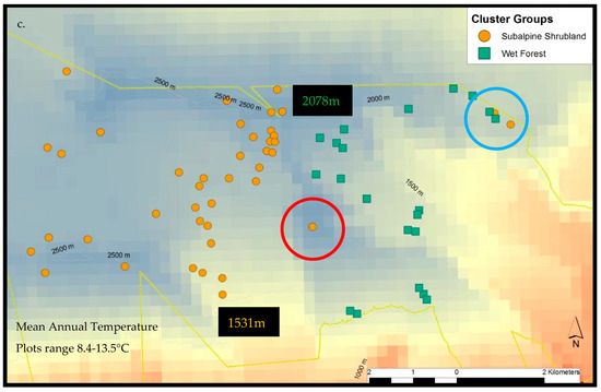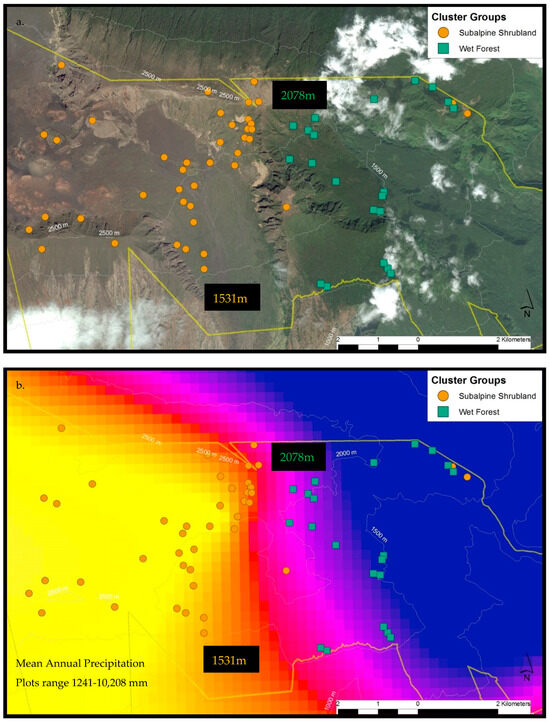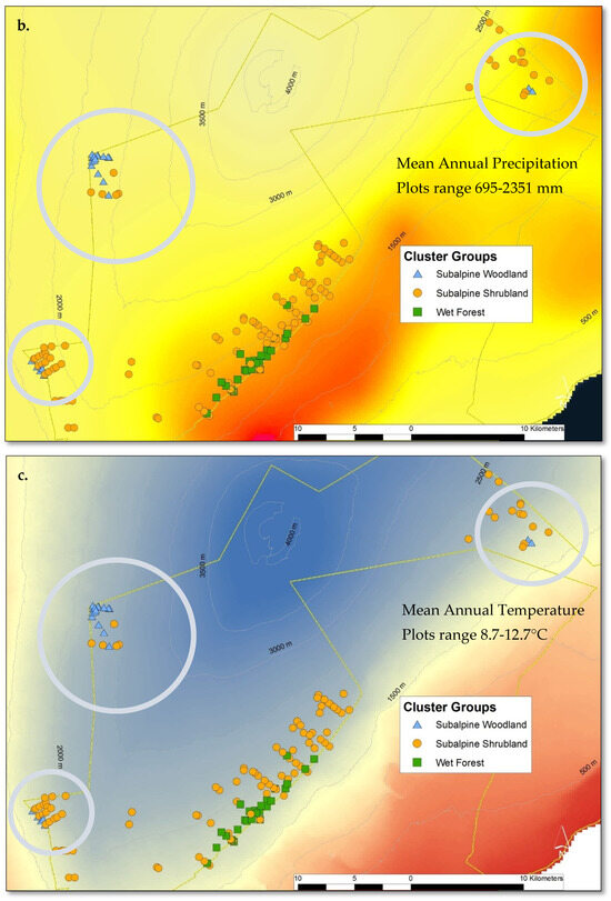 Haleakalā treeline ecotone sample plots by cluster group with the Haleakalā National Park boundary in yellow. On the windward side (northeast aspect), wet forest community plots reach elevations above 2078 m before transitioning into the subalpine shrubland, whereas on the leeward side (southeast aspect), the subalpine community persists below 1531 m (a). This site-specific spatial pattern corresponds with modelled mean annual rainfall (b), with three exceptionally wet subalpine plots. Two are within rare bog sites (blue-circled) and the other (red-circled) is presumably limited by cold temperatures (c).