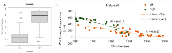 Haleakalā WF had significantly higher wet canopy evaporation than SS (a). The threshold where WF transitions to SS is between 200 and 400 mm for wet canopy evaporation, which decreases with elevation (b).