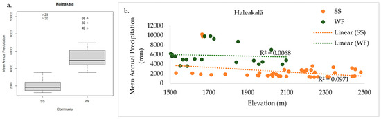 Haleakalā WF had significantly higher mean annual precipitation than SS (a). The threshold where WF transitions to SS is approximately 4000 mm mean annual precipitation, independent of elevation (b).