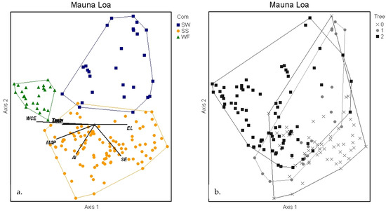 Temperature and its associated variables are also important for explaining patterns within the treeline ecotone, albeit to a lesser extent than moisture variables. Elevation serves as a surrogate for temperature on steep volcanic islands like these with wet adiabatic lapse rates of 6 °C per 1000 m in elevation. Elevation and minimum monthly temperature are strong correlates with axis 1, thus dividing WF and subalpine communities. Similarly to extreme drought events limiting tree growth within the treeline ecotone, extreme temperature lows, as captured by the monthly minimums, may exceed tree species’ physiological cold tolerance, as has been previously described for Metrosideros and Acacia on Hawai’i Island [55,56,57,58]. Interestingly, minimum temperatures on Hawaiian volcanoes are close to the global treeline annual growing season averages of 6–7 °C [3]. The mean annual temperatures of sample plots were much higher than global treeline averages, as expected for oceanic islands [14]. Between volcanoes, Haleakalā had colder SS and warmer WF minimum and mean annual temperatures than Mauna Loa. These differences highlight the potential importance of scale for temperature and also how microclimatic temperature conditions may differ because of microtopography (e.g., Figure 7c on Haleakalā and possibly the SS/SW boundaries in Figure 11c on Mauna Loa). Considering that warming—particularly at high elevations—is already occurring on the Hawaiian Islands [59,60], temperature may become even less important of an influence on treeline in the future. Even in temperate–treeline models, temperature is expected to cross a threshold this century, at which point other abiotic and biotic controls will limit treelines as opposed to temperature [19].