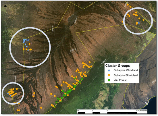 Mauna Loa treeline ecotone sample plots by cluster group with the Hawai’i Volcanoes National Park boundary in yellow. Plots in the subalpine woodland cluster group were only found on Mauna Loa adjacent to subalpine shrublands (a). The treeline ecotone between wet forest and subalpine shrubland corresponded with mean annual precipitation, like Haleakalā (b). The subalpine woodland was only found in dry sites, and the transition to subalpine shrubland may be correlated with local site temperature (c).