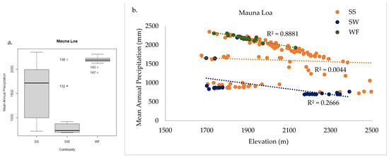 Mauna Loa mean annual precipitation significantly differed among communities (a), with high values in WF and low values in SW. The threshold where WF transitions to SS is approximately 2000 mm mean annual precipitation, independent of elevation (b). Thresholds for SW mean annual precipitation are less clear because site differences within the community are stronger than patterns between SW and SS communities.