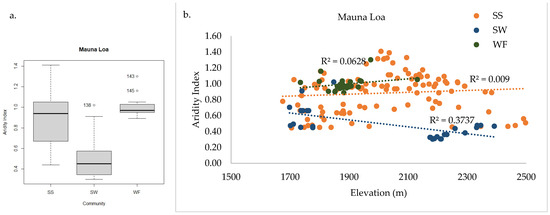 Mauna Loa aridity index values differed among communities (a), with significantly lower values in SW. The threshold where WF transitions to SS is, approximately, a 1.0 aridity index, independent of elevation (b). Thresholds for SW aridity index are less clear because site differences within the community are stronger than patterns between SW and SS communities.