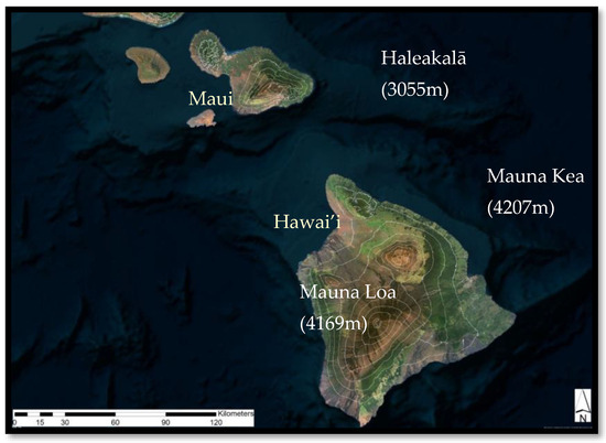 This study was conducted on the Hawaiian Islands, USA (19–22° N, 155–160° W; Figure 14). The Hawaiian Islands have three shield volcanoes tall enough to form distinct treeline ecotones: Haleakalā (3055 m) on Maui Island and Mauna Kea (4207 m) and Mauna Loa (4169 m) on Hawai’i Island. While these mountains share many abiotic and biotic features (e.g., volcanic substrate, species), plant community patterns and ecological processes differ on the volcano and local site scales. Previous studies have highlighted the Hawaiian Islands as the classic example of extreme isolation resulting in a depauperate flora lacking native tree species adapted to high-elevation, cold temperatures and thereby generating a “false treeline” [61]. The Hawaiian native species treeline is lower in elevation and warmer than the physiological limit for tree growth, as evidenced by the presence of invasive Pinus and Eucalyptus tree species at elevations well above the native treeline in the subalpine shrublands [51,62,63]. Additional studies hypothesized that tree growth above the treeline ecotone on windward Maui is limited by seasonal drought associated with the strong trade wind inversion (TWI) rather than by temperature above the treeline [11,13]. In contrast, on Hawai’i Island, studies have shown the physiological effects of freezing events on dominant Hawaiian tree species Metrosideros polymorpha and Acacia koa and proposed temperature as limiting tree growth [55,56,57,58]. Others have suggested that the lack of soil development on Mauna Loa, with its younger lava fields and sparse pyroclastic deposits, explains the lack of a distinct upslope belt of Sophora chrysophylla above the Metrosideros treeline [4]. Interpreting the community and ecosystem effects of the rapidly changing climate on treeline communities within the Hawaiian Islands [59,64,65,66] is challenging without a good understanding of the processes driving species and community distribution within the treeline ecotone.