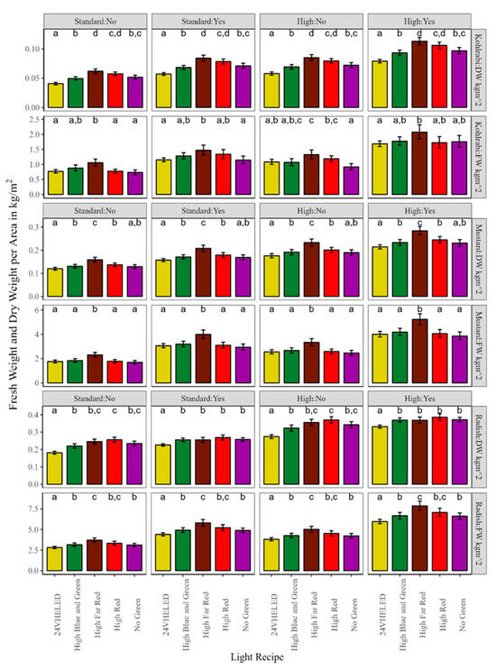 Facet graph detailing the kohlrabi (top), mustard (middle), and radish (bottom) FW and DW means (kg/m2) ± 95% confidence intervals at every combination of our experimental factors, seen as ‘Seeding Density: Fertilizer’. Coloured columns are associated with the Light Recipes: yellow (24VHELED), green (HBG), brown (HFR), red (HR), and purple (NG). Lowercase letters show the results of Tukey’s HSD within each panel, where common letters are not significantly different from one another at α = 0.05.