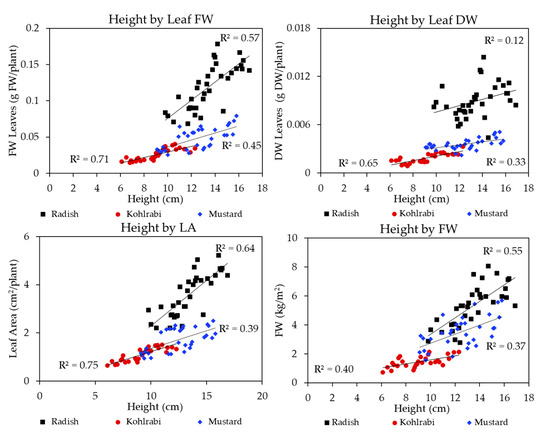 Figure 5 below shows regression plots for height by leaf FW, leaf DW, leaf area, and FW. The above figures showed that Far-Red light was positively associated with many improvements in microgreen morphology. These changes led to improvements in height and leaf area, for instance, which likely improved light interception and incident light. Therefore, adding Far-Red light was associated with morphological improvements, which in turn were correlated with increased biomass. This can be seen in the bottom-right figure, which shows that changes in height were associated with improvements in FW biomass accumulation for all three species. In general, kohlrabi (red circles) had the greatest fit, with the highest R2, while mustard (blue triangles) generally had the worst fit.