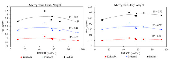 Scatterplots and quadratic curve fitting between FW (kg/m2) on the y-axis and Photosynthetically Active Radiation Cumulative Light Integral (PAR CLI; mol/m2) on the x-axis. Species shown as kohlrabi (red circle), mustard (blue diamond), and radish (black square) The corresponding R2 shown above each respective line.