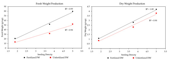 Furthermore, it is important to consider how the inherent life history traits impact the biomass results. For instance, kohlrabi had the lightest seed weight (approximately 0.16 g/100 seeds), mustard had the middle seed weight (approximately 0.72 g/100 seeds), and radish had the heaviest seed weight (approximately 1.32 g/100 seeds). Figure 7 shows the FW (left panel) and DW (right panel) averaged across Light Recipe and Seeding Density, with categories for Fertilized (black) and Unfertilized (red). Therefore, kohlrabi shows the leftmost, mustard shows the middle, and radish shows the rightmost points within each panel, respectively. The figures show that the production of the microgreens fits very closely with the starting seed amount. For FW with Fertilizer, there was an R2 = 0.99, and without Fertilizer, the R2 = 0.98. However, the slopes show that Fertilizer greatly improved the amount of biomass gained per unit of starting seed, with a slope 1.54 times greater than Unfertilized treatments. For DW, this relationship was less pronounced, with nearly parallel slopes (Fertilizer having only around 1.06 times the slope of Unfertilized treatments). With Fertilizer the DW R2 = 1.00, and without Fertilizer the R2 = 0.98. Figure 7 also shows that mustard was on average below the regression line. Overall, Figure 7 shows that radish produced around 3.80 times the FW biomass compared to kohlrabi and around 3.86 times the DW of kohlrabi. Mustard produced around 2.47 times the FW compared to kohlrabi and around 4.48 times the DW of kohlrabi. Finally, the radish produced around 1.53 times the FW biomass compared to the mustard and around 1.49 times the DW biomass. These values are generally the same, proportionally, across the Light Recipes and Fertilization levels.
