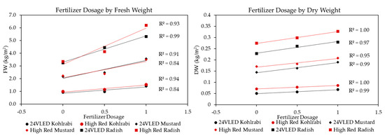 Regression plots showing the mean biomass of kohlrabi (circle), mustard (diamond), and radish (square) microgreens due to fertilization application at the levels of none (0), half duration (0.5), and full duration (1) for fresh weight (left panel) and dry weight (right panel) in units of kg/m2. Black lines show the 24VHELED, while the Red lines show the HR Light Recipe.