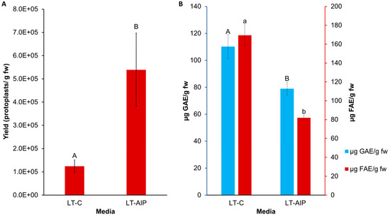 Comparison of LT-C and LT-AIP media with respect to protoplast yield and phenolic accumulation in callus tissues. (A) Protoplast yield from callus cultures grown on LT-C and LT-AIP media pooled from both 1- and 2-week subculture frequencies (n = 20). ANOVA revealed significant media effects (p = 0.0305). Yield reported as protoplasts/gram fresh callus weight (fw). Bars sharing the same letter were not significantly different at p ≤ 0.05 as determined by a Tukey-Kramer multiple comparisons test. Error bars represent standard error of the mean. (B) F-C assay (blue) and browning assay (red) averages compared between media types. Total soluble phenolics (µg of GAE—gallic acid equivalents) and tissue browning (µg of FAE—ferulic acid equivalents) at an optical density of 340 nm (OD340) in callus cultures on AIP-free (LT-C) and AIP-containing media (LT-AIP) pooled from both subculture frequency groups (n = 18). Error bars indicate standard error of the mean phenolic concentration for each media treatment, quantified in GAE or FAE. Bars sharing the same letter and case were not significantly different at p ≤ 0.05 as determined by a Tukey-Kramer multiple comparisons test.