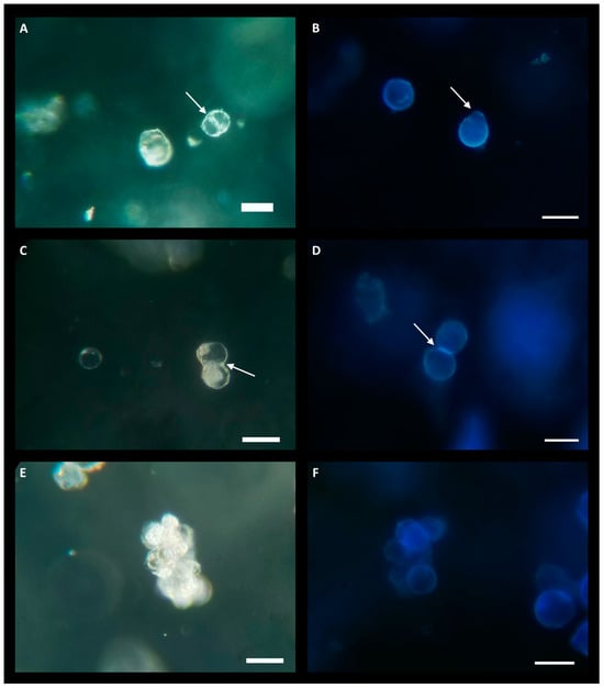 Due to the lower yield observed in the LT-C treatment, protoplasts were exclusively cultured from the LT-AIP treatment. Culturing experiments evaluated densities of 0.5 × 105, 1.0 × 105, and 2.0 × 105 protoplasts/mL. Low-melting-point agarose beads were cultured in liquid KM5/5 medium (Kao and Michayluk; see Section 4) [24] with and without 10 µM AIP. Protoplasts cultured at a density of 2.0 × 105 exhibited early signs of cell division, which were not observed at lower densities. Within 6 days of culture, indications of bulging cell membranes and the formation of peanut- and pear-shaped cells became evident, along with initial dividing cells (Figure 3A–D). After approximately three weeks of culture, small cell clusters (microcalli) had developed (Figure 3E,F). However, around the three-week mark, protoplast growth ceased, and cell viability declined. Protoplasts cultured in KM5/5 with 10 µM AIP at a density of 2.0 × 105 appeared to initiate cell division sooner than those in media without AIP. Cultures grown at 0.5 × 105 showed no response, while cultures at 1.0 × 105 exhibited limited cell division that was not sustained beyond one week.
