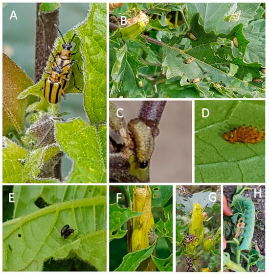 In Mexico, during the growing season (June–November), plants of D. stramonium are eaten by several insect species (see [,]). Commonly, D. stramonium is preyed upon by two leaf beetles (Coleoptera: Chrysomelidae), the tobacco flea beetle (Epitrix parvula) and the striped datura beetle (Lema daturaphila) ([,], by the seed predator (Trichobaris soror, Coleoptera: Curculionidae) [,,], the tobacco sphinx moth (Manduca sexta; Sphingidae) [] and by the generalist grasshopper, popularly known as “chapulín” (Sphenarium purpurascens, Orthoptera: Pyrgomorphidae) [] (Figure 1).