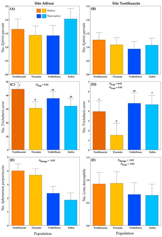 Mean number (+S.E.) of herbivores on native and non-native plants of Datura stramonium at two experimental sites: Atlixco (A,C,E) and Teotihuacán (B,D,F). Significant effects are indicated, and different letters within a panel indicate significant differences between populations (p ≤ 0.05) according to post hoc t-tests (see also Table S1). Range = Between ranges (Mexico/native, Spain/non-native); Pop = between populations within range; Fam = among families within population.