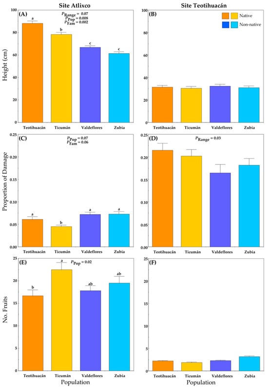 Average values (+S.E.) of plant traits of native and non-native plants of Datura stramonium at two experimental sites: Atlixco (A,C,E) and Teotihuacán (B,D,F). Significant effects are indicated, and different letters within a panel indicate significant differences between populations (p ≤ 0.05) according to post hoc t-tests (see also Table S1). Range = Between ranges (Mexico/native, Spain/non-native); Pop = between populations within range; Fam = among families within population.