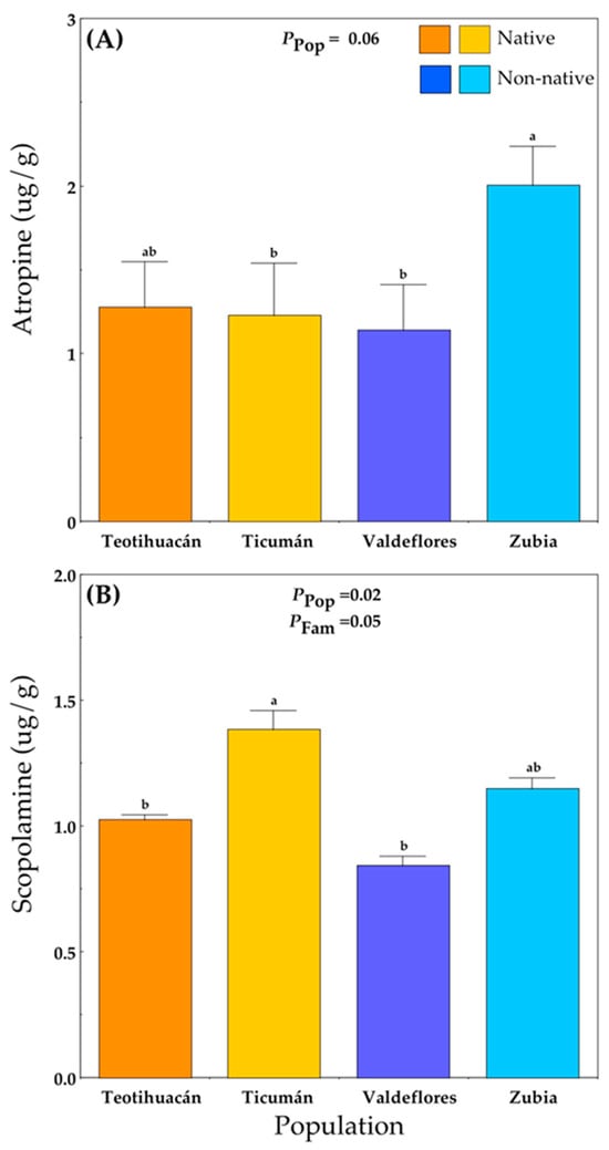 Alkaloid concentrations were only measured at the Teotihuacán site. Plants from the non-native Zubia population produced the highest concentration of atropine, while plants from the native Ticumán population and the non-native Valdeflores population had the lowest atropine levels (Figure 4A; Table S1E). Scopolamine levels differed among populations and families (Figure 4B; Table S1E). The native Ticumán population had the highest mean scopolamine value, which differed significantly from the native Teotihuacán and the non-native Valdeflores populations (Figure 4B).