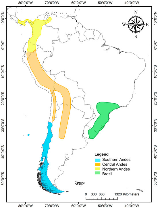 The genus Escallonia has 39 species distributed in South America, mostly along the Andes from Panamá to Tierra del Fuego; the northern and central Andes have the highest richness species, followed by Chile, the southern coast of Brazil, Uruguay and Juan Fernández Island [23]. Escallonia can be grouped into four zones according to the morphological characteristics and phytogeographic regions [24] (Figure 1): (1) Southern Andes, including mainly central–southern Chile and Chilean and Argentina Patagonia. There are 13 species in this zone. (2) Central Andes, including Andean zones of northern Chile, Peru, Bolivia and Argentina, in addition to Yungas, mostly above 2000 m in altitude, with 11 species. (3) Northern Andes: this belongs to the Páramo region, extending from Venezuela to the Huancabamba Depression, a biogeographic barrier [25] that begins at the Jubones River (at 4° S), considered the southern limit of our northern Andes [26]. There are six species distributed at over 2000 m in altitude in Panama, Colombia and Ecuador. Some species are also distributed in the central Andes from 4° S to 20° S, including Peru and part of Bolivia. (4) Southeast of Brazil, including southeastern Brazil and eastern Uruguay, with nine species of Escallonia. It is important to note that some species exhibit a broader distribution range, covering more than one area, such as Escallonia micrantha Mattf., Escallonia pendula (Ruiz and Pav.) Pers., Escallonia paniculata (Ruiz and Pav.) Roem. and Schult., Escallonia schreiteri Sleumer, Escallonia resinosa (Ruiz and Pav.) Pers., and Escallonia myrtilloides L. F., which cover portions of the central and northern Andes. The species that are distributed in southeast Brazil and Uruguay live in warmer and rainy conditions, and the Chilean and Argentine species are in the coldest zones (Table 1).