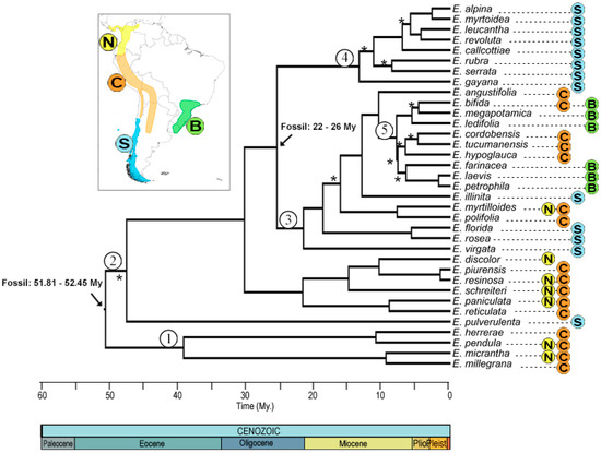 Consensus phylogenetic tree obtained from Bayesian analysis. The distribution of the genus Escallonia with the corresponding color nomenclature of each node is shown in the upper left box. The black arrow corresponds to the nodes used to calibrate the phylogeny, with their respective ages and data used. The numbers within a circle correspond to the nomenclature that will be used to name the nodes. Asterisks mark the nodes with a posterior probability of <0.95. Colors and letters indicate the nomenclature of the distribution zones.